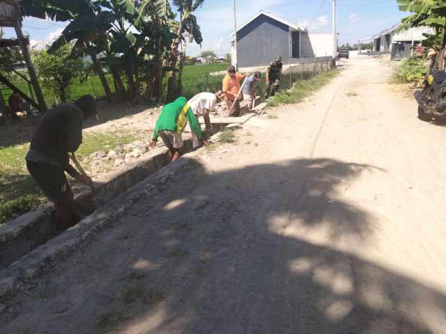 Kegiatan ini melibatkan staf pemerintah desa serta warga setempat yang bahu-membahu membersihkan tumpukan sampah dan sedimen lumpur yang menyumbat drainase di sekitar pemukiman penduduk.