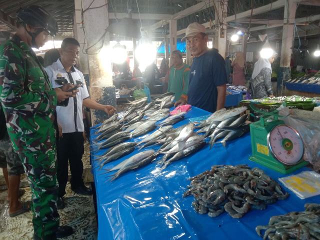 Anggota Koramil 01/Panca Lautang Sertu Isman, berkeliling ke sejumlah lapak pedagang untuk memantau langsung harga-harga komoditas utama seperti beras, minyak goreng, gula, telur, dan cabai.