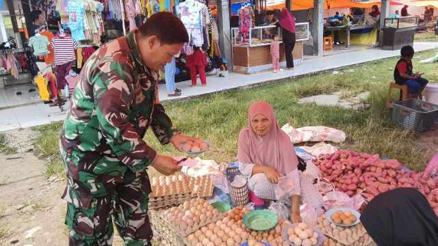 Dalam blusukannya ke area pasar, Serka Anwar berinteraksi langsung dengan para pedagang dan pembeli untuk mengecek beberapa komoditas utama.